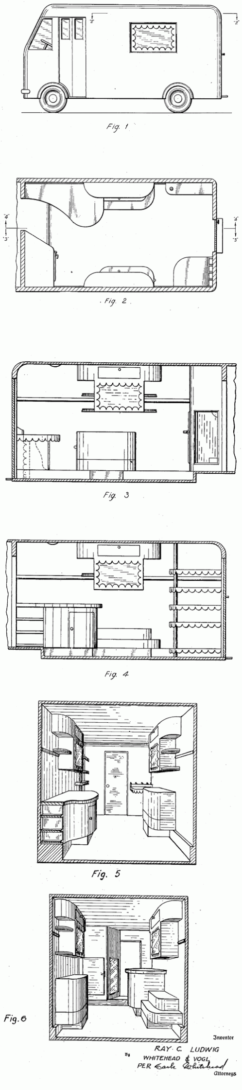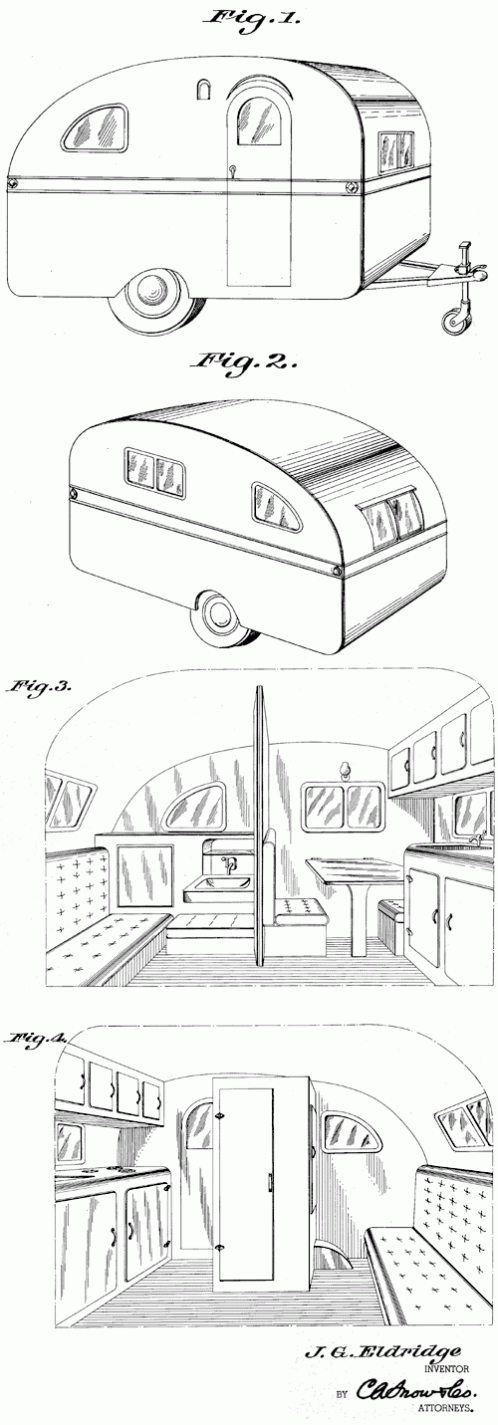 A classic design for a camping trailer that features a dinette, bench seating and two sinks, which seems an excessive luxury in a trailer of this size. 1950. Invented by Joseph G. Eldridge.