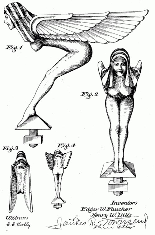 A winged Egyptian goddess hood ornament. 1928. Invented by Edgar W. Faucher and Henry W. Dills.