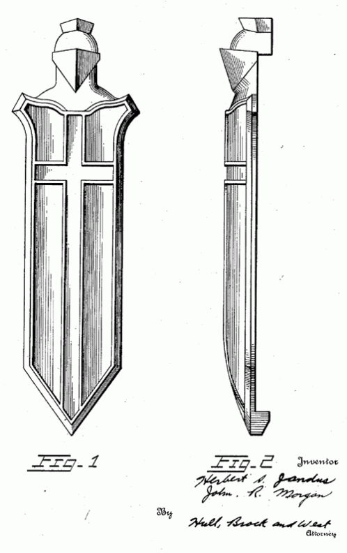 A knight and shield ornamental bumper clamp. 1927. Invented by Herbert S. Jandus and John R. Morgan.