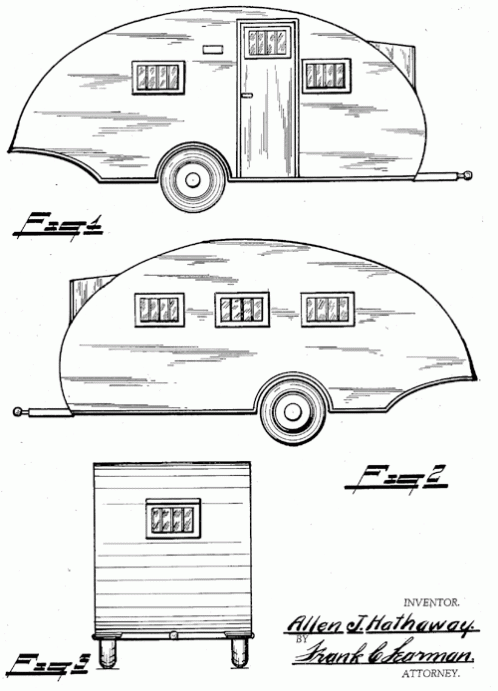 A camping trailer design for the Alma Trailer Company of Michigan. 1936. Invented by Allen J. Hathaway.