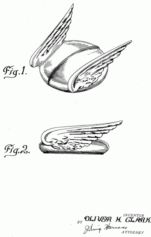 This is another design for a winged radiator cap by Oliver H. Clark. Another version can be seen here. This design was for the Maxwell Motor Corporation, which later became the Chrysler Corporation. 1924. Invented by Oliver H. Clark.